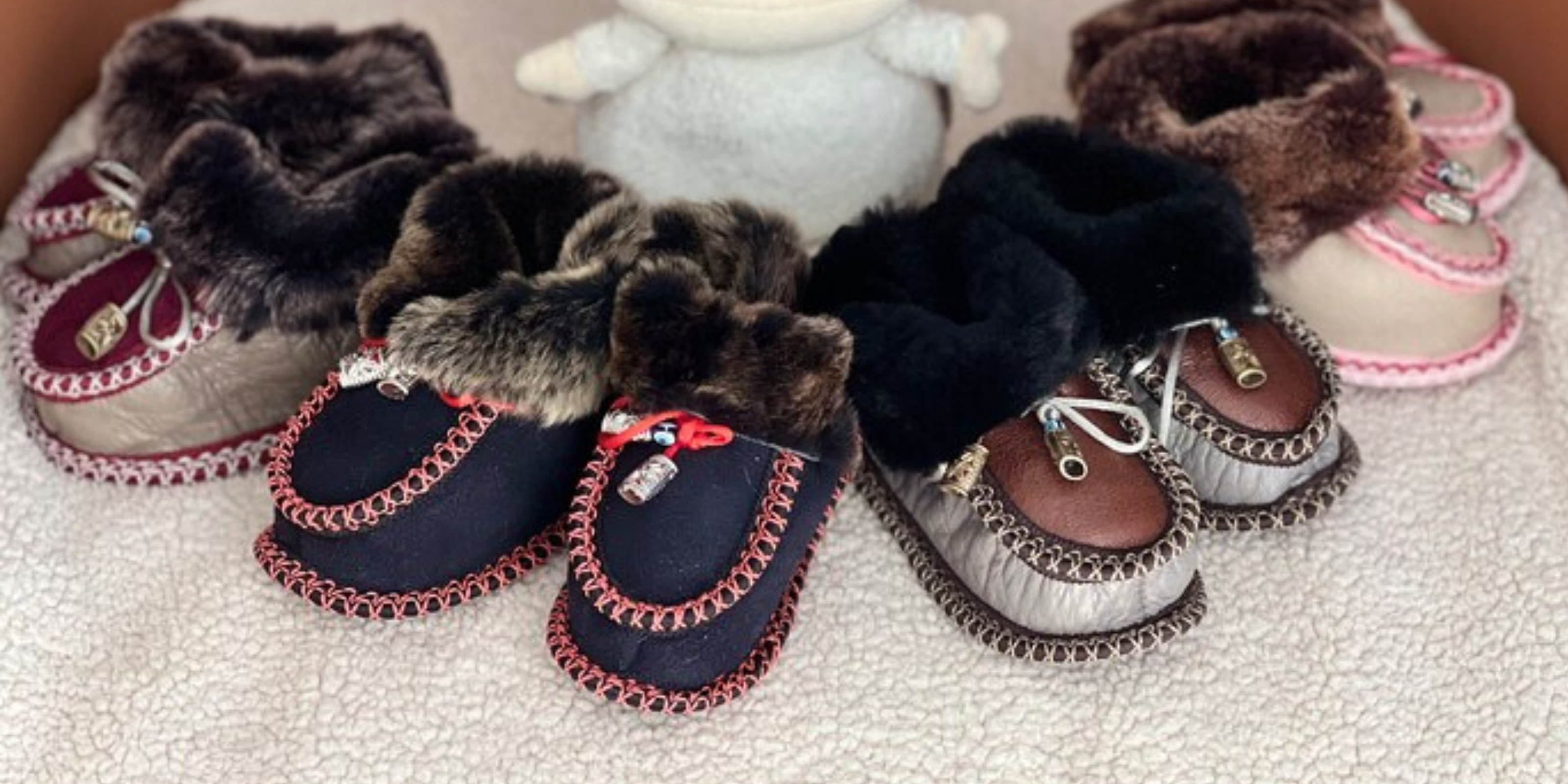 Unsere Eskimo Winterschuhe aus Schaf- und Lammfell werden liebevoll von Fatima und Ihrer Tochter in der Türkei genäht. Fatima ist in einer kleinen Stadt in Anatolia geboren. Sie erlernte das verarbeiten von Leder in einer Werkstatt. Jetzt in ihrem Ruhestand näht Sie diese wundervolle Babyschuhe Zuhause.